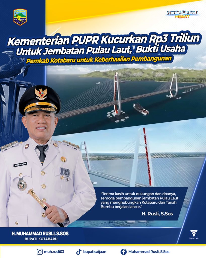 Pemerintah Pusat melalui Kementerian Pekerjaan Umum dan Perumahan Rakyat (PUPR) memberikan kepastian menyokong pembangunan Jembatan Pulau Laut (Kotabaru)- Pulau Kalimantan (Tanah bumbu), kepastian itu berupa alokasi anggaran Rp3 triliun.Kepastian kucuran anggaran pemerintah pusat ini didapat pemerintah provinsi belum lama tadi. Melalui Plt Kepala Dinas Pekerjaan Umum dan Penataan Ruang (PUPR) Kalsel, M Yasin Toyib mengungkap, pekerjaan bentang tengah Jembatan Pulau Laut sudah ada kepastian, menyusul sudah dilakukannnya lelang pekerjaan oleh Kementerian PUPR.“Perjuangan untuk mendapatkan kucuran anggaran pemerintah pusat akhirnya berhasil. Melalui Kementerian PUPR, pembangunan bentang tengah Jembatan Pulau Laut dibantu sebesar Rp3 triliun,” beber Yasin, Kamis (25/9).Sementara itu, Bupati Kotabaru Muhammad Rusli, S. Sos, mengucapkan terimakasih kepada pemerintah pusat yang telah mengucurkan anggaran untuk pembangunan jembatan Pulau Laut yang menghubungkan antara Kabupaten Kotabaru dan Tanah Bumbu yang benar-benar segera terwujud.“Terima kasih untuk dukungan dan do’anya, semoga pembangunan jembatan Pulau Laut yang menghubungkan Kotabaru dan Tanah Bumbu berjalan lancar,” harapnya.Penyelesaian pembangunan jembatan tersebut, juga termasuk dalam Visi-Misi Bupati dan Wakil Bupati Kotabaru, yakni, Mewujudkan Kotabaru Hebat (Harmonis, Energik, Bersatu, Amanah, dan Tangguh), yang diwujudkan melalui misi seperti pembangunan kewilayahan yang merata dan berkeadilan serta penyediaan infrastruktur yang berkualitas dan ramah lingkungan, termasuk penyelesaian jembatan penghubung yang menjadi fokus utama untuk meningkatkan konektivitas dan kesejahteraan masyarakat.Seperti diketahui, sejak pertama kali dikerjakan pada 2015 melalui peletakan batu pertama oleh Wakil Presiden Jusuf Kalla, proyek jembatan ini sempat terhenti pada 2017 karena belum memperoleh rekomendasi dari Komisi Keamanan Jembatan dan Terowongan Jalan (KKJTJ). Setelah dilakukan peninjauan ulang, desain jembatan pun disesuaikan agar mendapat persetujuan.Dalam rancangan terbaru, panjang total jembatan mencapai 3.750 meter dengan tipe bentang utama cable stayed beton edge beam (175m + 350m + 175m) dan lebar 24 meter. Tinggi jembatan yang semula direncanakan 40 meter dikurangi menjadi 30 meter sesuai rekomendasi KKJTJ. Sementara bentang pendekat menggunakan box girder, dengan panjang 950 meter di sisi Batulicin dan 1.950 meter di sisi Kotabaru.Selain itu, jembatan penghubung akan memanfaatkan konstruksi pile slab, masing-masing sepanjang 75 meter di kedua sisi. Jalan pendekat juga dibangun cukup panjang, yakni 1.500 meter di arah Batulicin dan 1.250 meter di arah Kotabaru, dengan lebar 24 meter. Dengan kepastian anggaran pusat ini, pembangunan Jembatan Pulau Laut—yang digadang menjadi jembatan terpanjang di Kalimantan—dipastikan terus berlanjut dan menjadi proyek strategis yang akan membuka akses ekonomi baru di wilayah selatan Kalimantan.Membangun jembatan penghubung Kotabaru-Tanah Bumbu bukan hanya sebuah proyek infrastruktur. Ini adalah investasi untuk masa depan masyarakat, membuka pintu bagi kemajuan sosial ekonomi, persatuan, pendidikan, dan layanan kesehatan. Dengan menghubungkan 2 Kabupaten yang terpisah, jembatan penghubung menjadi simbol harapan.