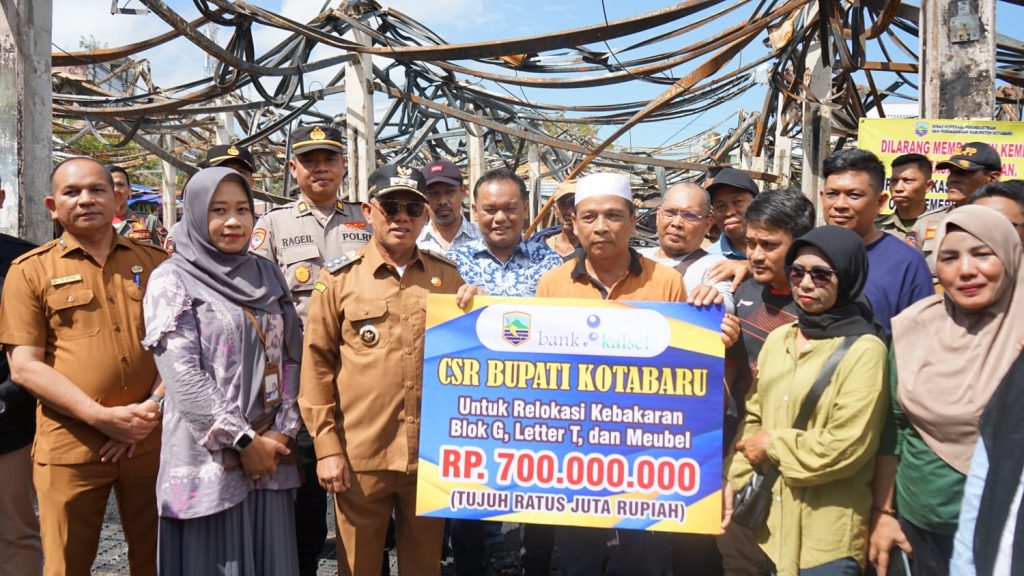 Sebagai wujud kepedulian Bupati Kotabaru H.Muhammad Rusli, S. Sos menyampaikan rasa duka sekaligus menyerahkan bantuan CSR Bank Kalsel kepada 167 kios pedagang terdampak, berupa uang senilai total Rp. 700 juta. Selasa (07/10/2025).