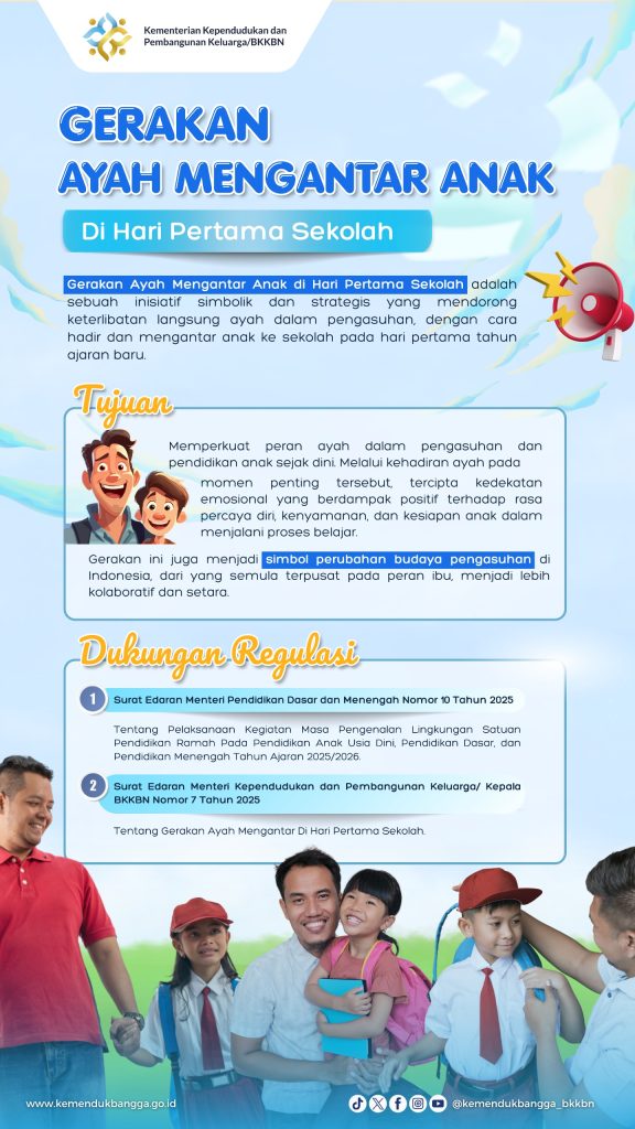 Pemerintah Kabupaten Kotabaru menghimbau para Ayah untuk mendukung program Gerakan Ayah Mengantar Anak di Hari Pertama Sekolah Secara Serentak pada Senin, 14 Juli 2025 mendatang.Program ini dicanangkan melalui Surat Edaran Menteri Pendidikan Dasar dan Menengah Nomor 10 tahun 2025, serta Surat Edaran Menteri Kependudukan dan Pembangunan Keluarga/ Kepala BKKBN Nomor 7 tahun 2025. Pemerintah Kabupaten Kotabaru melalui Dinas Pemberdayaan Perempuan, Perlindungan Anak, Pengendalian Penduduk dan Keluarga Berencana, dengan Nomor 400.13/572/DPPAPPKB/2025, tentang Bantuan Penyebaran Informasi di Media Terkait Kegiatan Mengantar Anak Hari Pertama ke Sekolah dalam mendukung Gerakan Ayah Teladan Indonesia (GATI).Gerakan ini bertujuan untuk memperkuat peran ayah dalam pengasuhan, pendidikan anak sejak dini, melalui kehadiran ayah pada momen penting.Gerakan ini juga menjadi simbol perubahan budaya pengasuhan Indonesia, dari yang semula terpusat pada peran ibu, menjadi kolaboratif dan setara.Melalui Via Whatsapp, Sabtu (12/07/2025) sore. Kepala Dinas Pemberdayaan Perempuan, Perlindungan Anak, Pengendalian Penduduk dan Keluarga Berencana (DPPPAPPKB) Ir. Sri Sulistiyani, M. PH mengatakan, Momen mengantar anak di hari pertama sekolah, dapat membangun rasa percaya diri, dan semangat pada diri anak, karena adanya dukungan orang tuanya terutama ayah, karena hari pertama sekolah merupakan peristiwa penting bagi anak-anak dimana kelak sampai dewasa akan selalu diingat.“Keterlibatan ayah sangat penting dalam proses tumbuh kembang anak secara optimal, baik dari segi emosional, psikologis maupun sosial, salah satu upaya adalah dengan melibatkan peran ayah untuk mengantar anak ke sekolah, dan dengan adanya Partisipasi ayah dalam pendidikan anak sejak hari pertama sekolah merupakan bentuk keteladanan yang akan membentuk karakter generasi masa depan,”ungkapnya Via Whatsapp.Dalam Surat Edaran tersebut, juga dihimbau, untuk mendokumentasikan kegiatan dalam bentuk foto, video, atau testimoni, untuk disebarluaskan melalui media sosial dan kanal komunikasi resmi SKPD.Gerakan ini diharapkan dapat mendorong terciptanya lingkungan keluarga yang lebih peduli terhadap pendidikan anak sejak dini, serta menghadirkan sosok ayah yang terlibat secara utuh dalam kehidupan anak.