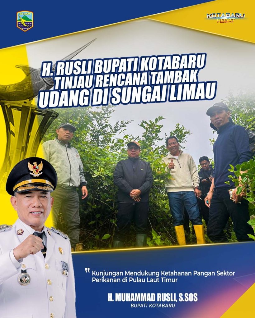 Bupati Kotabaru Muhammad Rusli, S.Sos meninjau lokasi rencana pembangunan kawasan cluster percontohan budidaya udang intensif berbasis kawasan di Desa Sungai Limau, Kecamatan Pulaulaut Timur, Sabtu (05/07/2025). Survei tersebut merupakan langkah nyata Bupati Kotabaru dalam rangka mendukung ketahanan pangan di sektor perikanan. Dan langkah tersebut mendapat dukungan penuh dari Kementerian Kelautan dan Perikanan melalui UPT. Balai Besar Perikanan Budidaya Air Payau Jepara sebagai pendamping teknis. Dalam hal ini, Bupati Muhammad Rusli menekankan rencana tambak udang dapat menjadi upaya mendukung ketahanan pangan, terutama jika dikelola dengan baik dan berkelanjutan. “Kunjungan mendukung ketahanan pangan sektor perikanan di Kecamatan Pulau Laut Timur,” tegasnya. Dalam kesempatan tersebut, Bupati juga meminta pihak PT. PLN untuk bekerjasama dalam penyediaan jaringan listrik ke lokasi tambak, sehingga kegiatan budidaya udang bisa berjalan lancar. Adapun lahan yang tersedia kurang lebih sekitar 10 ha (hektar), yang didalamnya nanti akan dibangun area budidaya udang yang lengkap dengan sarana pendukung lainnya. Dengan membangun kawasan cluster percontohan budidaya undang intensif berbasis teknologi ini diharapkan bisa meningkatkan produksi udang dalam 1 hektar yang mencapai 10-15 ton per-hektar. Dimana dengan harga jual udang vaname sekarang dipasaran sekitar 60-75 ribu rupiah/kg untuk ukuran 50-60 ekor/kg. Tujuan dari pembangunan untuk meningkatkan produktivitas lahan pesisir, memberikan pelatihan teknologi modern budidaya undang, meningkatkan ekonomi dan kesejahteran masyarakat Desa/pesisir. Kawasan cluster percontohan budidaya undang tersebut juga memiliki kelebihan yang lebih efesien biaya dan mudah dirawat, optimal di lahan terbatas, mudah dipantau dan dikontrol.Dari pembangunan kawasan nanti diharapkan dapat berdampak dalam ekonomi masyarakat Kotabaru.Dalam tinjau tersebut, Bupati Kotabaru didampingi langsung langsung oleh Sekretaris Dinas Perikanan Sarawani, S.Pi.MP